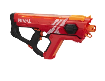 RapidStryfe 22: A speedy, powerful fully automatic blaster the size of a pistol. Load in the 22-round banana mag and spray at your foes at a speed of upto 8 darts per second! Includes a detachable stock, barrel, and scope. Having the form factor of a Stryfe, speed of a Perses, and the price of a Rapidstrike, this blaster will rule the competition. Magazines, barrels, and stocks from the N-Strike or G-Strike series will fit on the blaster.