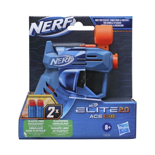 Bring along the compact Nerf Elite 2.0 Ace SD-1 blaster on all your missions and battles! Take advantage of this blaster's compact size when you've got to move with stealth. Bring this compact blaster almost anywhere to launch into a stealth games and dart-blasting surprise attacks. It has onboard 1-dart so you can keep a second dart within reach for fast reloads. It comes with 2 Official Nerf Elite foam darts, so you can blast them indoors or outdoors. Get battling in 3 quick steps: Load 1 dart into the front of the barrel, pull the priming handle, and press the trigger to unleash the dart. Eyewear recommended (not included). No batteries required. Nerf and all related properties are trademarks of Hasbro.