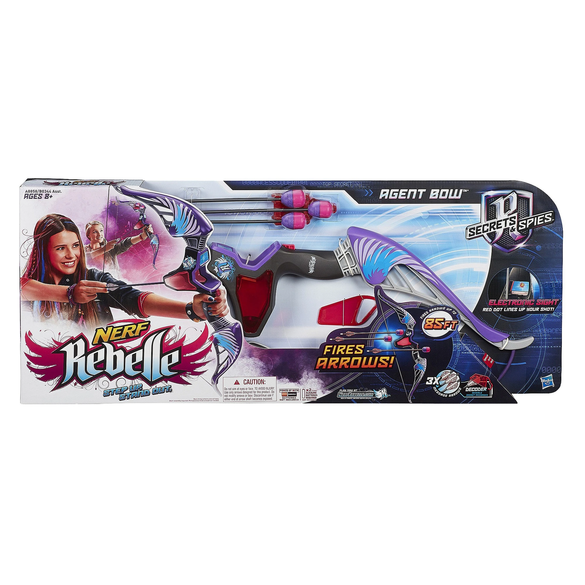 Arm yourself with the Secrets and Spies Agent Bow blaster to take control of the mission with the top-notch performance of a master spy. The bow fires Nerf Rebelle Message Arrows up to 85 feet, and the arrows make a whistling sound as they fly through the air. Experience real bow action as you set the arrow on the bow, nock it between the marks, draw the string back, align your shot with the red-dot sight, and release the arrow toward your target. |