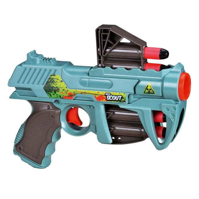 The Auto Scout is a clip-fed blaster. Its clip feeds through the blaster vertically, and auto-advances upwards on the prime. It has a set of iron sights, one on the priming slide and one above the muzzle.