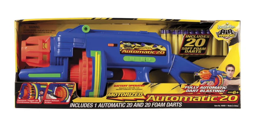 The Automatic Tommy 20 is a Buzz Bee blaster that was released in 2008 under the Ruff Stuff Air Blasters and Air Blasters series simultaneously. It requires three "AA" batteries to be operated.