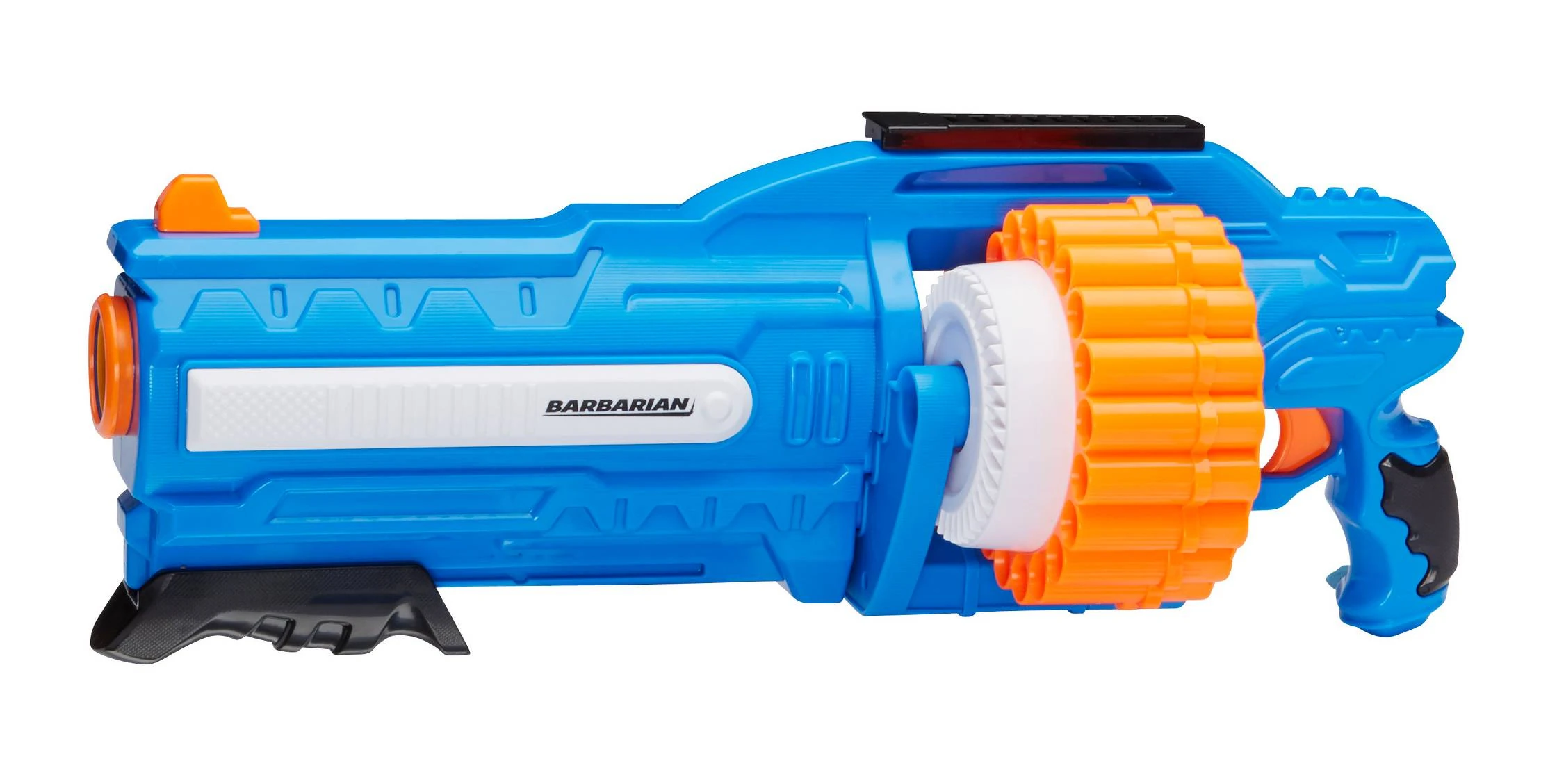 The Barbarian is a HAMP-action blaster. It features a removable forty dart section that is comprised of two twenty dart drums that rotate together via a gear system. These drums auto-advance upon pulling the priming handle back.