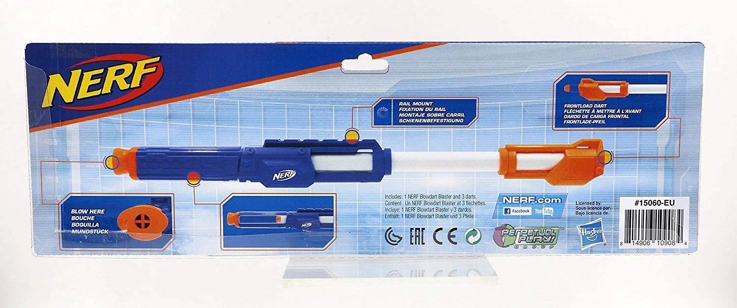 The Blowdart Blaster is a blowgun-style blaster very similar to the 2016 Zombie Strike SilentStrike. Its main difference is its color scheme and the darts it comes packaged with. It also has one tactical rail and two sling mounts.