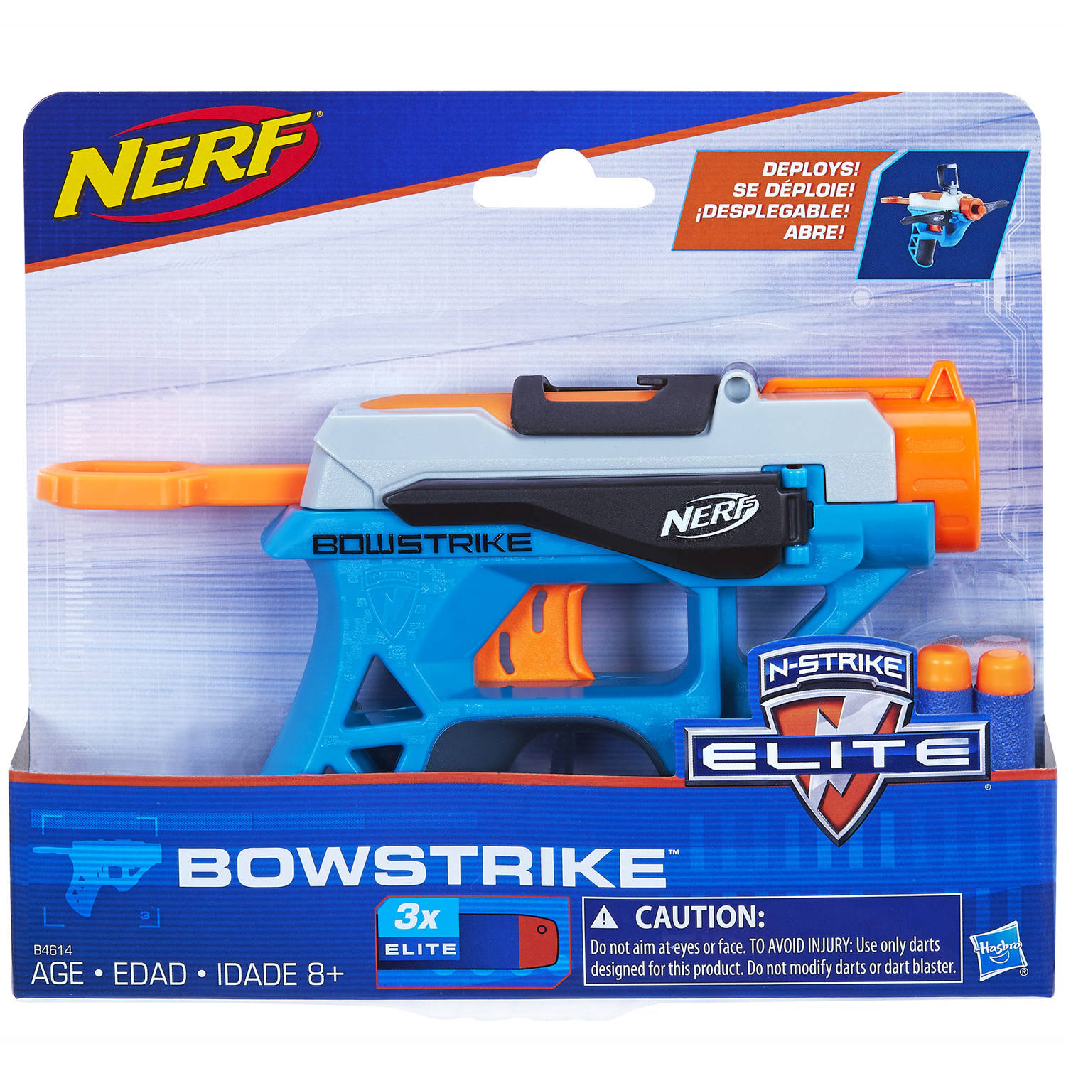 Strike the competition with BowStrike blaster! Pull the handle back to deploy the bow arms and flip the sight up. The Nerf N-Strike BowStrike blaster has a compact size for stealth blasting and comes with 3 darts. |