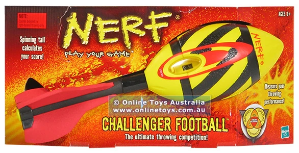 NOTE: Counter designed for right-handed throwing only. Throw the ultimate pass – NERF style! The CHALLENGER FOOTBALL is the only football that shows how well you throw the ball. It’s designed to measure the tail rotations, which are dependant upon the distance, speed and number of spirals of every throw. Now you can compete against a friend and see who can score higher! The better you throw… the more tail rotations… the higher your score! The football does the math, but only you can throw the ultimate pass! What’s your score? |