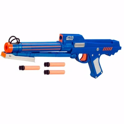 The Clone Trooper Blaster is a slide-action blaster. It resembles the BlasTech DC-15A blaster carbine used by the clone troopers the Clone Wars TV series. It has an integrated light which activates upon trigger pull, as well as a place to store two additional darts under the barrel. A set of decorative wires atop the muzzle can act as an iron sight.