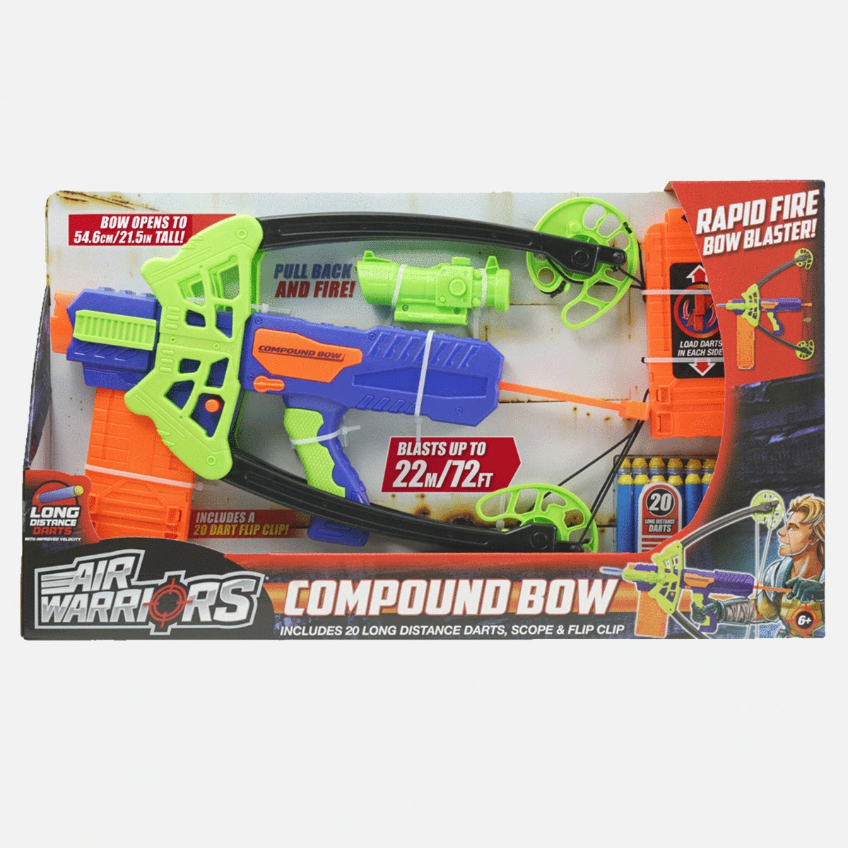 Buzz Bee Toys Air Warriors Compound Bow dart blaster brings realistic bow action with the feel of archery with its moving cams. The bow opens to up to 21.5 inches tall. This rapid fire bow dart blaster launches darts instead of arrows for safe fun. Load your darts, get steady… aim in your target in the detachable scope… pull back the string and blast a dart. Watch your darts fly up to 100 feet. Item features a flip clip for continuous dart blasting action. When one 10 count dart clip runs outs, flip it around for another 10 count dart clip. Item includes dart blaster bow, flip clip, 20 long distance darts and scope. Recommended for children 6 years of age and older. |