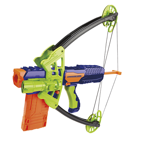 The Compound Bow is a bow-action clip-fed blaster. It features a set of folding bow arms which mimics the function of an actual compound bow. The blaster has one tactical rail on each side for its included scope.