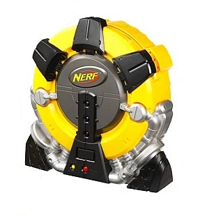 The Disk Shot is a Nerf-branded disc launcher. The disc launcher is unique in that it fires discs into the air for the player to fire at, much like actual skeet shooting. Discs are launched by using the packaged remote, which can be attached to a blaster via tactical rail.