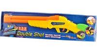 Similar to its original iteration, the Double Shot is a break-action dart blaster. It is loaded by shells, which eject out when it is opened back up to be loaded again. It features a two-step firing trigger - the user can pull it halfway to fire a single dart, or all the way to fire both loaded darts at once. Its two barrels are aligned vertically, rather than horizontally. The blaster also features a compartment in its integrated shoulder stock, where two additional shells can be stored.