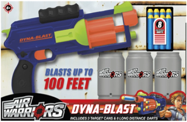 Buzz Bee Toys Air Warriors Dyna-Blast is a great hand-held weapon of choice for any battle. The six shot dart blaster features automatic advancing darts for quick dart blasting. And with the ability to blast up to 100 feet, you can take out your target from a great distance. Also, comes with three cans for target practice. Recommended for children 6 years of age and older. Item includes dart blaster, 20 long distance darts and 3 target cans. |