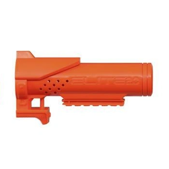 The Eaglepoint barrel extension is a medium-length barrel extension. It features a short tactical rail and a strap attachment point on the bottom. An unpainted text reading "Elite 2.0" is molded on the side of the barrel.