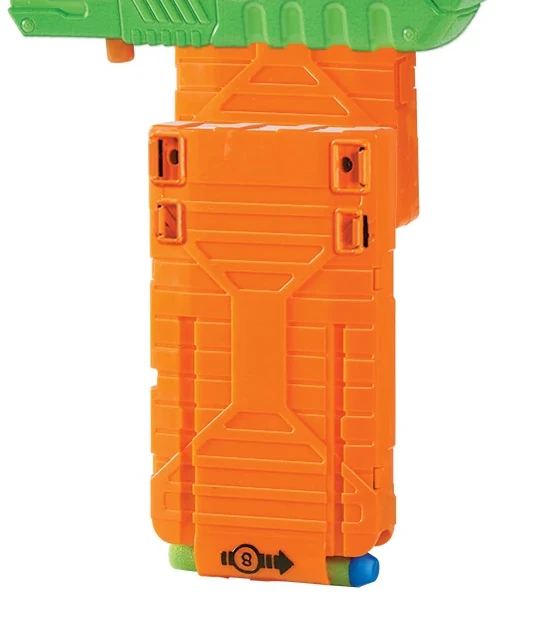 The eight dart Flip Clip is Nerf clip system compatible, allowing it to be used with any clip system-compatible blasters or darts.