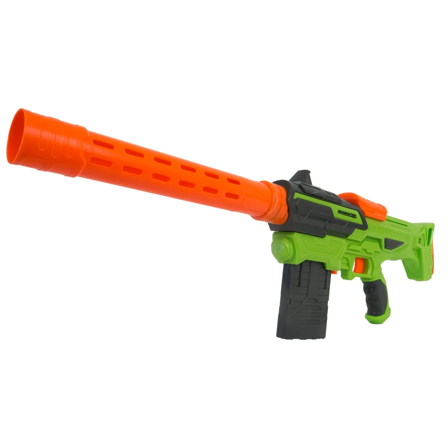 The Eradicator is a slide-action clip-fed blaster. Its clip release button sits behind the clip well. Despite coming with a barrel extension, it is not compatible with other Buzz Bee barrel accessories.