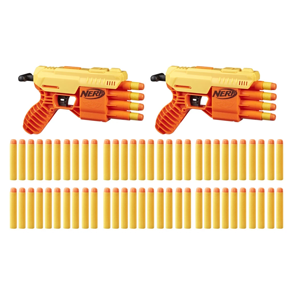 This 2-blaster set comes with a whopping 68 darts, so you and another player have plenty of darts to keep on reloading -- and keep on blasting! The Load Out Set includes 2 Fang QS-4 blasters that are easy to use to get you battling fast: Load 4 darts into each blaster, pull the handle to prime, and press the trigger to fire 1 dart. Official Nerf Elite darts are tested and approved for performance and quality and constructed of foam with flexible, hollow tips. No batteries required. |