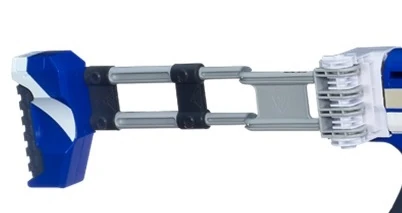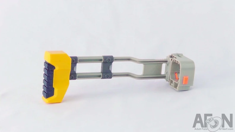 The Folding Stock, as the name suggests, can be flipped 180 degrees to fold onto the right hand side of a blaster. Due to its length, younger users may have a difficult time using it.