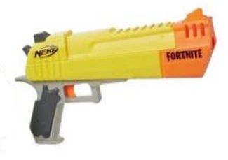 The HC-L is a single-fire, front-loading blaster that fires Mega Darts. It is based on the Legendary Hand Cannon weapon from Fortnite. It has a pair of iron sights, although there is no notch on the rear sight. The grooves at the top of the barrel that represent the in-game weapon's rail is for aesthetic purposes only, and is not compatible with any tactical rail accessories.