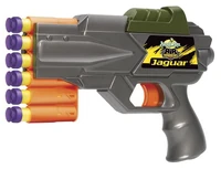 The Jaguar features an integrated six dart clip that cannot be removed from the blaster. The clip can be manually advanced by pushing or pulling the clip in or out of the blaster. Like the Buzz Bee Cougar, the clip advances upwards when the blaster is primed. It can be advanced multiple times even if the blaster is primed and ready to fire.