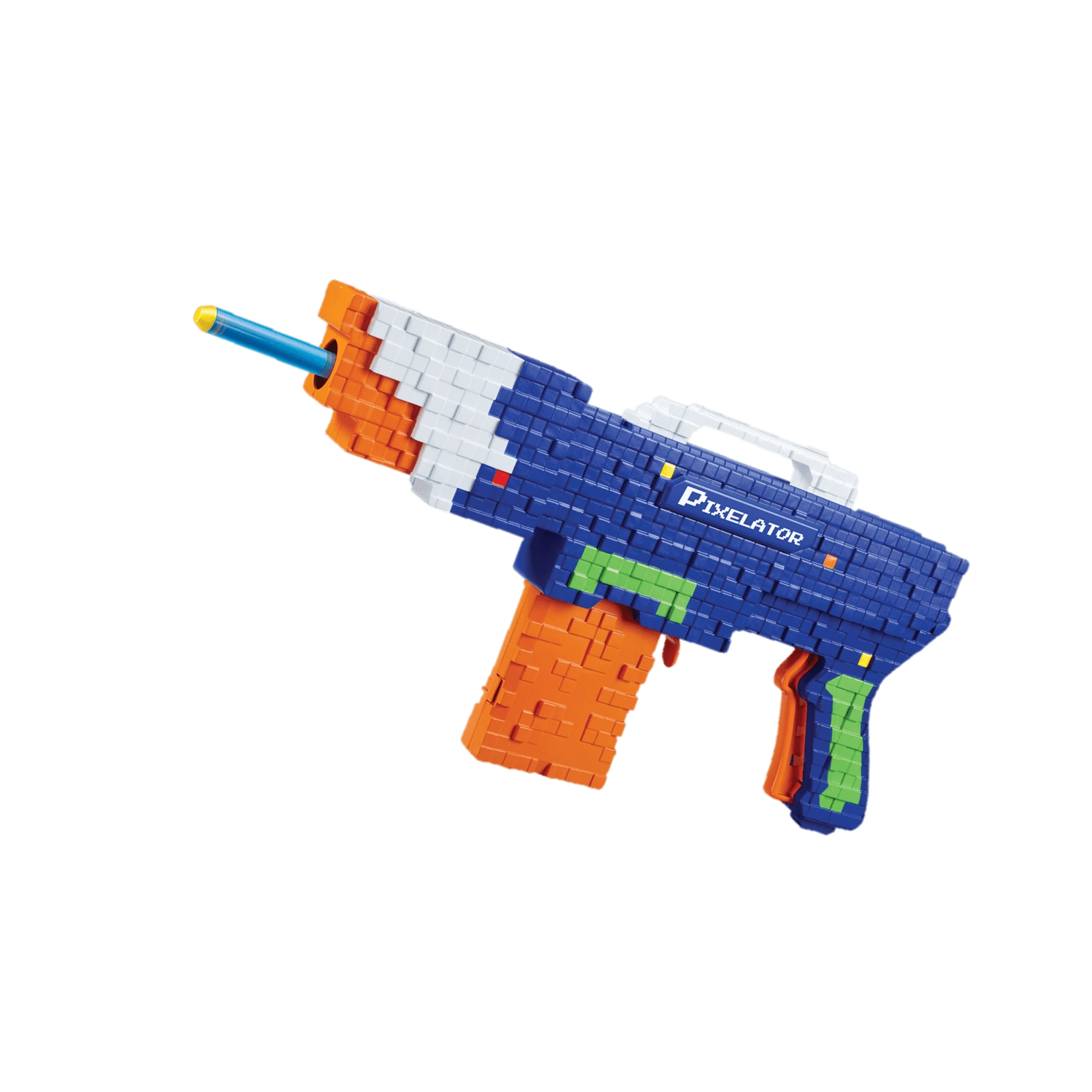 The Pixelator is a slide-action clip-fed blaster. The shell of the blaster is divided into equally-sized cubes, meant to emulate a pixelated video game weapon. Its firing trigger is unique and is the length of the entire trigger handle. The priming slide doubles as a carry handle; atop this handle is an accessory rail.