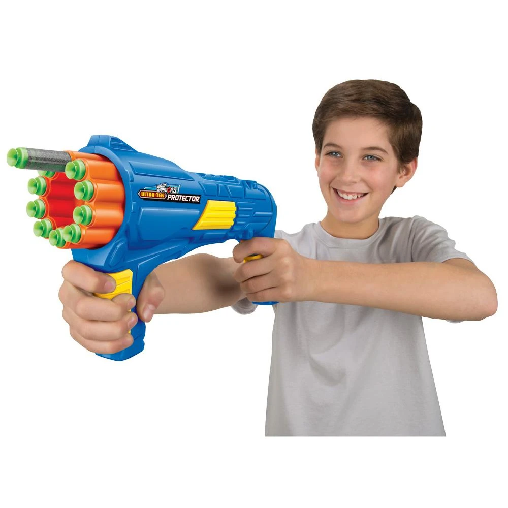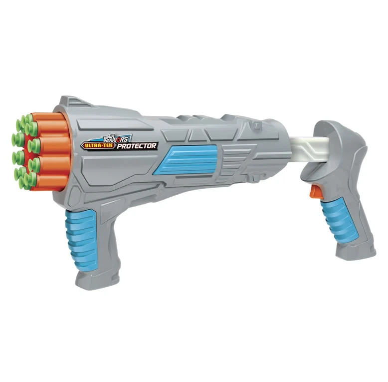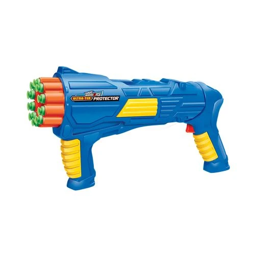 The Protector is a blaster with a front turret that holds up to ten darts at a time. It features a false, non-functioning firing trigger, and is instead fired through HAMP-action.