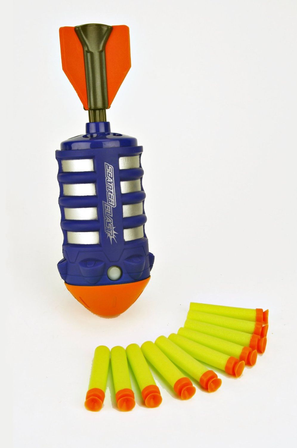 The Scatter Blast is a grenade-style weapon that fires six darts around the area upon impact with the ground or an object. Darts are loaded into the back part of the weapon. A large fin similar to Nerf footballs like the Mega Aero Howler doubles as a pumping apparatus, to fill the weapon's air tank; it requires about fifteen pumps[1] to fully fill the tank for use. A safety switch is built into the Scatter Blast, which effectively keeps darts from accidentally firing. The trigger tip is made of foam, and the whole body of the weapon is covered in foam, to make it safe for indoor use.