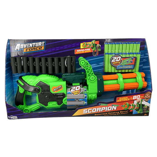Give your adventurous child a toy they’re sure to love with this Scorpion Gatling Blaster from Adventure Force! Designed with a fully automatic motorized rotating barrel with rapid-fire action, this unique foam dart blaster holds 1 round of ammo of 20 darts. With an impressive 80-foot launch distance, the Powerbolt Belt Blaster combines speed, distance and the strength of motorization to keep your game sharp and you playing for longer. Ideal for a dart blaster game amongst friends, or to practice your shot on your own, this versatile foam dart blaster includes an impressive 20 foam darts that are compatible with all Adventure Force Blasters and most standard other major brand blasters. |