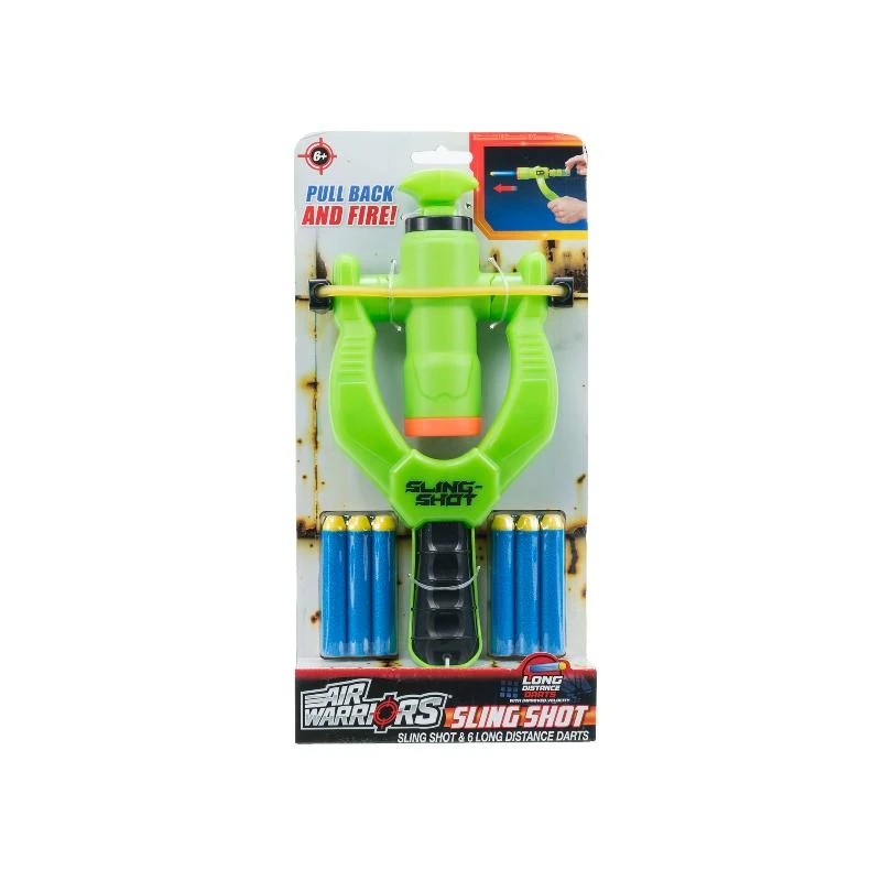Buzz Bee Toys Air Warriors Sling Shot takes dart blasting to a different level. This classic design allows you to play indoor or outdoor blasting your long distance darts. Just pull back on the sling shot, aim and hit your target. Recommended for children 6 years of age and older. Item includes 1 blaster and 6 long distance darts. |