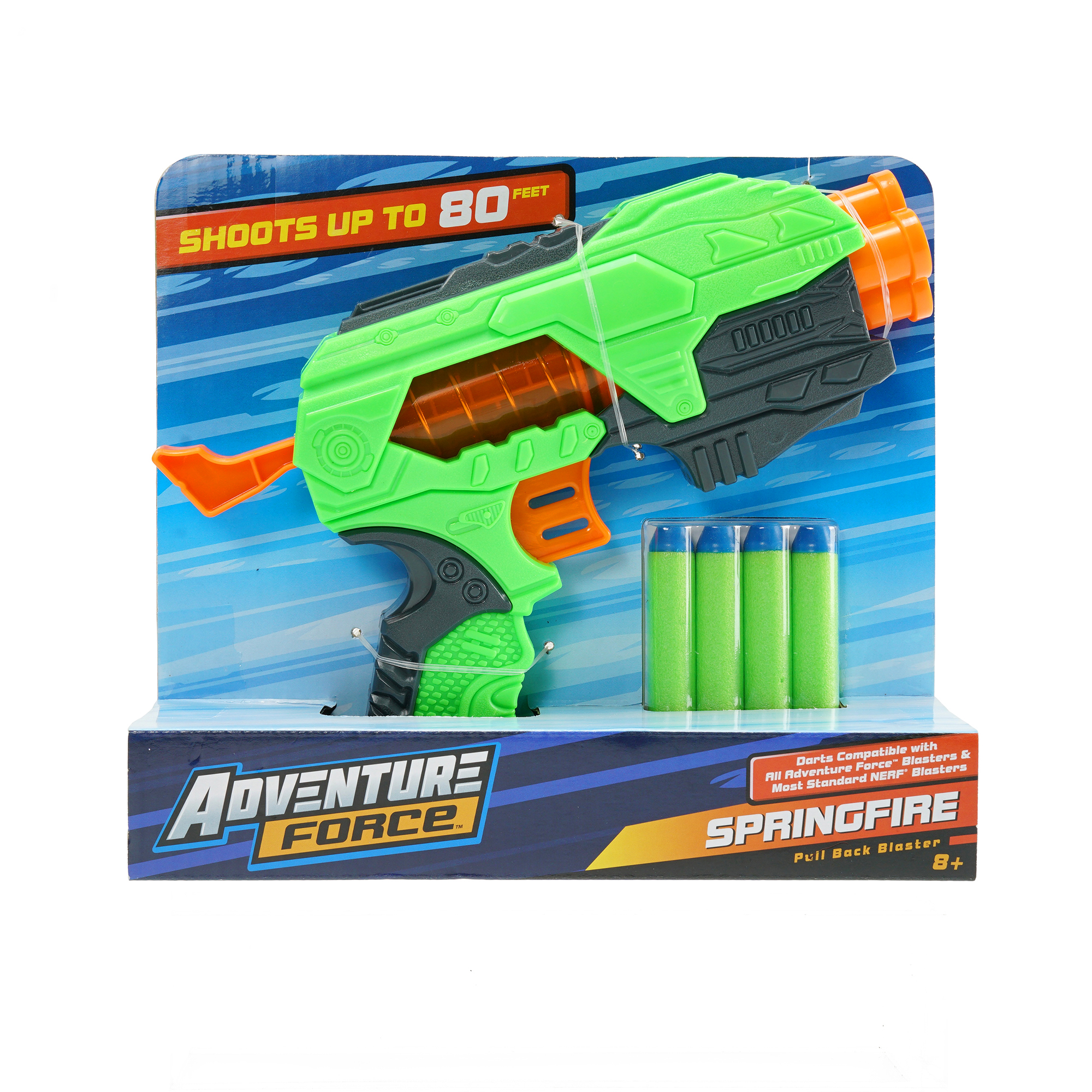 Adventure Force Springfire takes you behind the scenes and at the front of the line Adventure Force Springfire is everything you need to bring with you to the arena if you want to show your opponents what it takes to be a champion. Incredibly light yet powerful and portable, this dart blaster is worthy of even the most skilled players, and the see-through design sets it apart from all the blasters out there. Get ready, aim, blast! Take aim at the target and blast the dart up to 80 feet, making sure no opponent gets away! When mobility, speed, and accuracy matter the most, take Adventure Force Springfire with you, the only blaster capable of keeping up with your superior skills. Adventure Force Springfire works for you! If you need a dart blaster that packs an extra punch, Adventure Force Springfire is the blaster you have been waiting for. It is the on-the-go dart blaster with spring power. This dart blaster will provide hours of quick dart blasting action up to 80 feet away with its easy pull-back handle and automatic advancing barrels. It was engineered to shoot further, faster, and more accurately, securing you the tactical advantage and unforgettable experience. Go ahead, don’t be afraid to brag a little. You know your dart blaster will be the talk of the town, so we made sure it is easy to show off. The see-through body was designed to feature and emphasize the extraordinary spring power. Warning: Adventure Force Springfire is not for the faint of heart – it was designed for champions no one will ever be able to forget. You have complete control of the dart blaster, and it will help you effortlessly control the entire arena. Insert four darts into the barrel, pull back the rear handle, adjust the barrel to the top blasting portion, aim, and blast the dart. Your opponents will not know what hit them! Step up your game with the leading dart blaster We are focused on reinventing how blasters are made, from delivering new ways of blasting to driving the blaster game to the next level with innovative design. Our darts were carefully crafted for distance, tested for unparalleled performance and excellence, and we used foam with flexible, tips to ensure they’re perfectly safe. With Adventure Force Springfire, every backyard and living room can become the ultimate arena in an instant. Your job is only to unleash a fast, fierce wave of foam on your opponents and watch them run for cover. No matter what sort of mission you planned – stealthy or all-out dart frenzy – this dart blaster will help you make sure you are always victorious and remain undefeated. Item includes dart blaster and 4 long-distance darts and is a great gift idea for newbies and experienced pros alike. This blaster is recommended for children 8 years of age and older. To avoid injuries, never modify darts or parts of the blaster. The foam dart is made of high-quality soft foam, tested for quality and safety, and designed for the longest blasts ever, but should not be shot in the face without wearing protective glasses. |