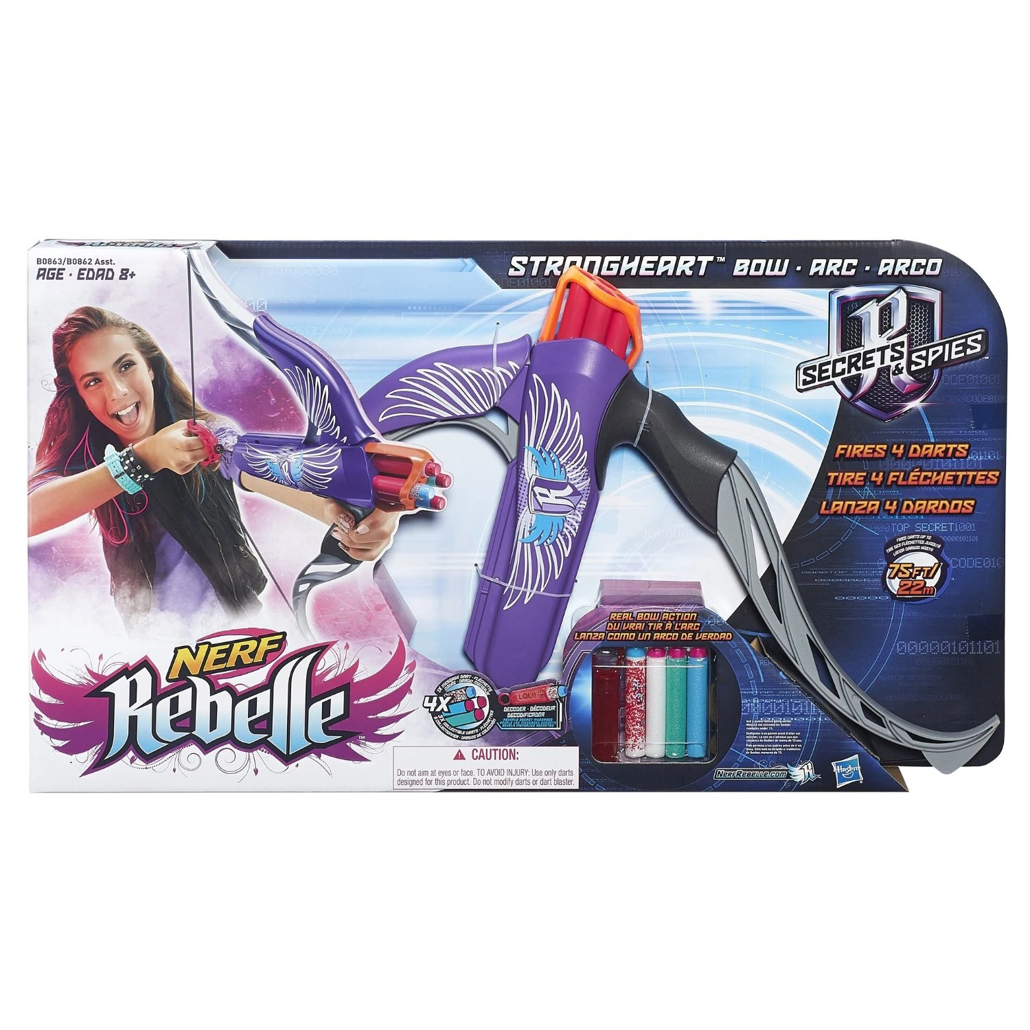 Fire 4 Darts in a Row With the Nerf Rebelle Secrets and Spies Strongheart Bow, you can unleash 4 darts in a row, 1 at a time, without reloading! Take control of the field as you blast darts up to 75 feet. Feel the rush of real bow action as you load the darts, pull back the string, and let them fly. Take the Strongheart Bow on your spy missions to defend your team and outblast opponents. With its stylish design and bright coloring, the Nerf Rebelle Secrets and Spies Strongheart Bow shows your spy style! Nerf Rebelle and all related properties are trademarks of Hasbro. Decoder Reveals Secret Message The Nerf Rebelle Secrets and Spies Strongheart Bow comes with a decoder that reveals secret messages on Message Darts. When you are on a mission, give it to a friend so she can decode the messages you send to her. You can also use the decoder to reveal messages your fellow spies send to you with their own Message Darts. Slide the dart into the decoder and the hidden message is revealed! The bow comes with 1 Message Dart and 3 collectible darts. Show Your Spy Style With its real bow action, the Nerf Rebelle Secrets and Spies Strongheart Bow lets you showcase your bow-blasting skill and your spy style. Take aim, unleash 4 darts in a row up to 75 feet, and send a secret message to a friend. Take control of your spy missions with the Nerf Rebelle Secrets and Spies Strongheart Bow! |
