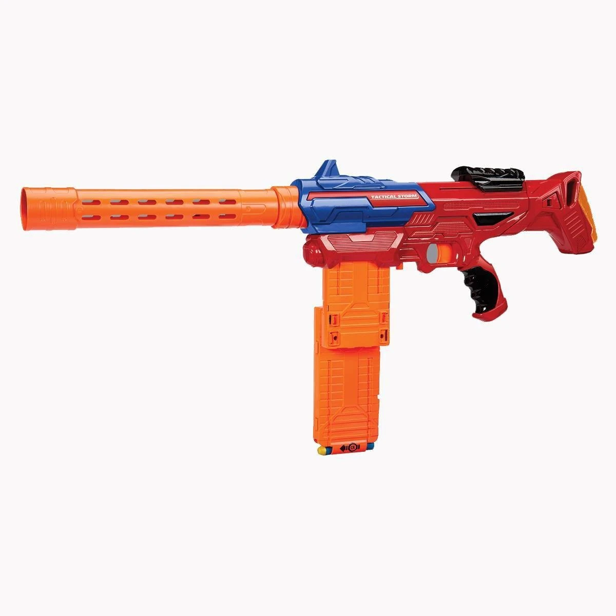 The Tactical Storm is a clip-fed blaster. It has a clip release button behind the clip well. Despite coming with a barrel extension, it is not compatible with other Buzz Bee barrel accessories.