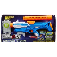Buzz Bee Toys Air Warriors Tactical Storm features a flip clip for continuous dart blasting action. When one 10 count dart runs outs, flip it around for another 10 count dart clip. Assemble your blaster with the screw in barrel and detachable stock when you are ready to start your mission. Pull back on the slide and you’re locked, loaded and ready to launch a dart up to 100 feet away. Recommended for children 6 years of age and older. Item includes dart blaster, flip clip, stock, barrel and 20 long distance darts. |