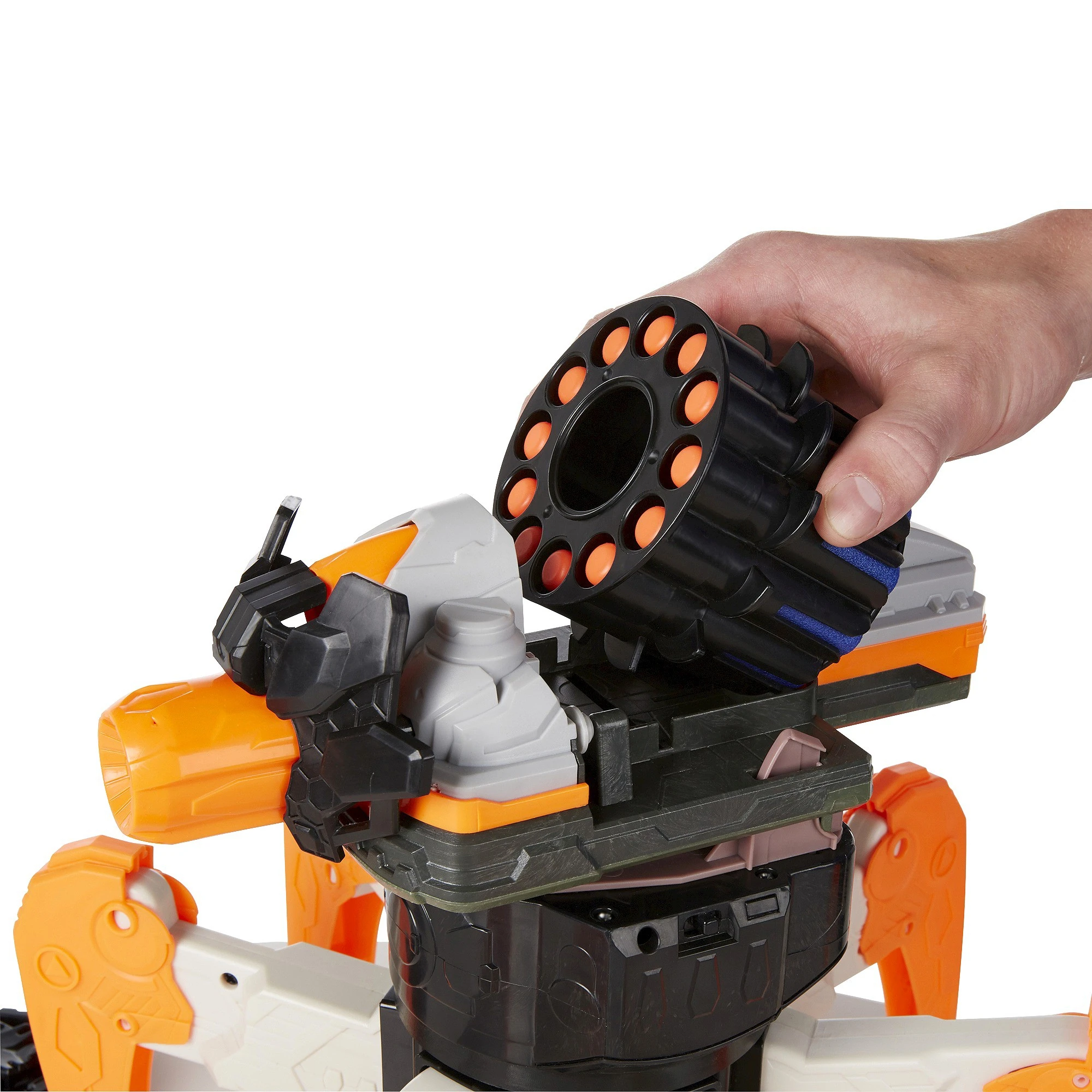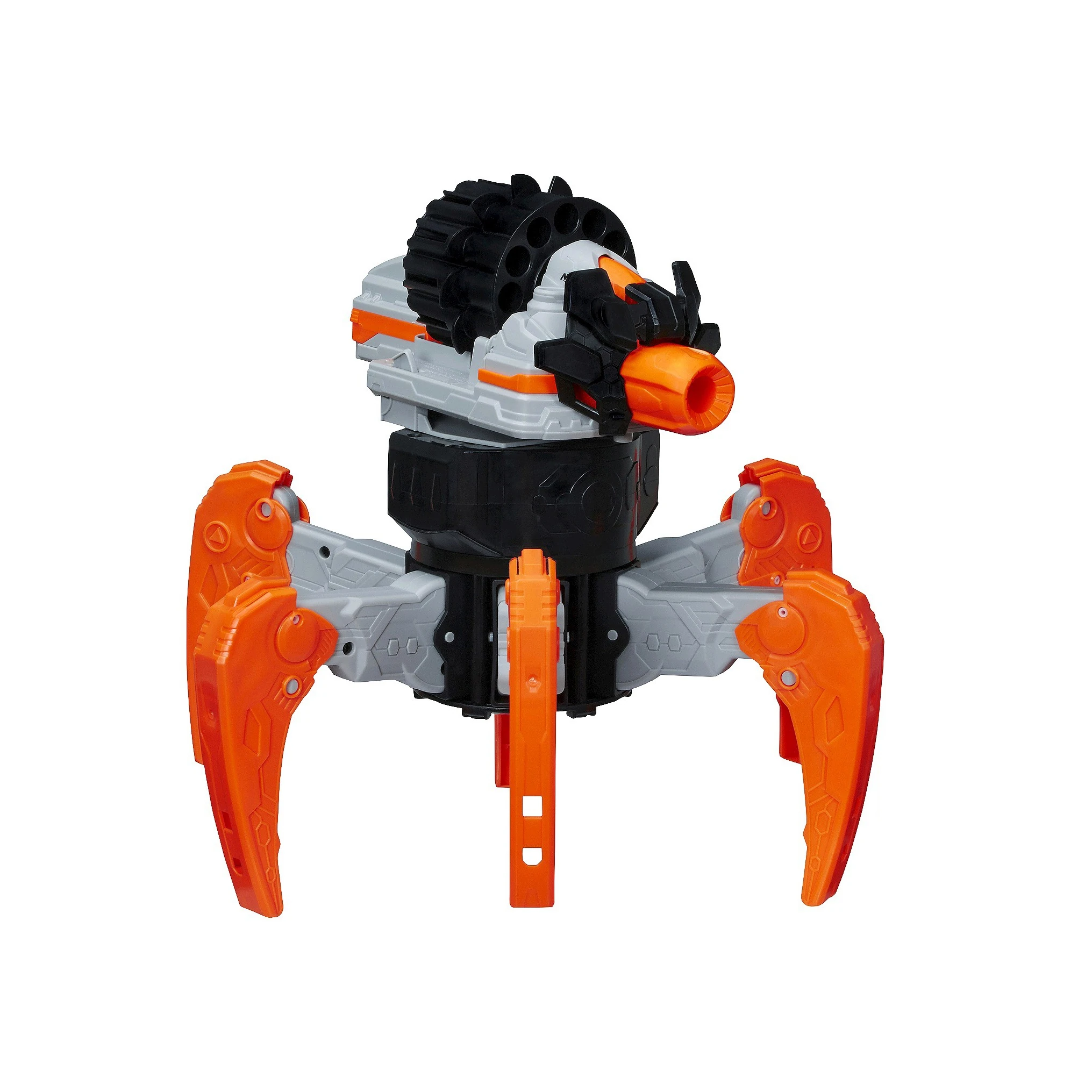 The TerraDrone is a remote-controlled robot. It has the ability to rapidly fire darts from a cylinder located on top of it. Its turret "head" has the ability to rotate 360 degrees, and can pivot up and down. It walks on six robot legs. The TerraDrone is flywheel-powered, and has fully-automatic capabilities (albeit with a slow fire rate). The cylinder itself is removable and holds twelve darts.