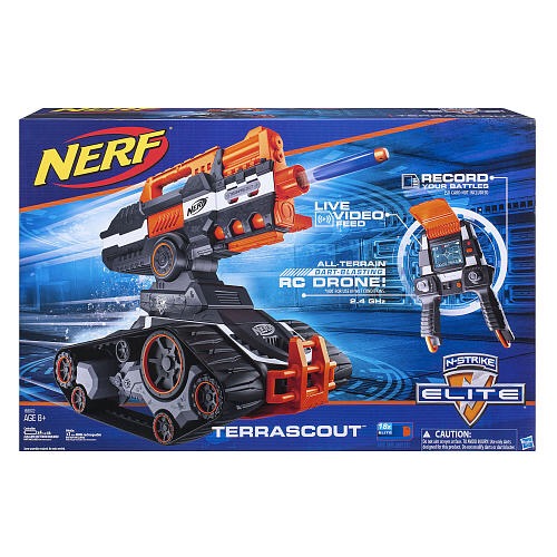 The TerraScout is a fully-automatic[2], clip system, remote controlled, blaster-like drone that has the ability to fire darts. It comes packaged with a 720p video camera[2], which can be equipped and viewed through the remote on an integrated LCD screen; this can be doubled as a portable aiming device. It has two tactical rails: one on its built-in handle and one below the muzzle. It is also compatible with barrel extensions.