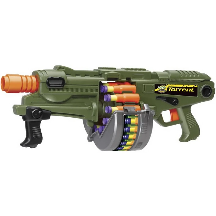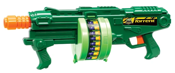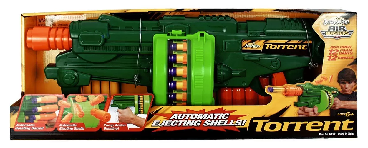 The Torrent is a spring-powered blaster that uses Buzz Bee's shell system. Because of this, the blaster features an area where the shells are released. It features a built-in drum capable of holding up to twelve darts and has tactical rail-esque rails on the top of it.