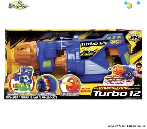 The Turbo 12 is a Buzz Bee blaster that was released in 2011 under the Air Warriors series. It requires three "AA" batteries to be operated.